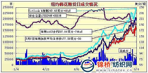 3月8日紐約期棉市場全面下跌,主力5月和1107月合約跌停,1112月合約120.75美分/磅,跌578點。當日市場低開低走,早盤5月合約跌停。后在投機買盤和貿(mào)易買盤支持下觸底反彈,5月合約最高達到215.75美分,盤中高位震蕩,交易后期,由于外部谷物、油料和原油期貨全面下跌,投機商清算多頭,期棉從高位下滑,5月合約封于跌停。 紐約期棉近期1105合約近三個交易日交易走勢 紐約棉評:投資者結(jié)清頭寸 期棉收低
