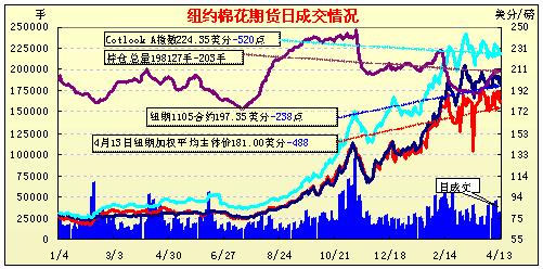 4月13日紐約期棉近弱遠(yuǎn)強(qiáng),近期前兩個(gè)合約大幅收跌,遠(yuǎn)期合約相對(duì)強(qiáng)勢(shì)。當(dāng)日市場(chǎng)早盤交易清淡,盤中受到買盤支持大幅走強(qiáng),近期5月合約最高至漲停板206.73美分/磅。但隨后很快打開漲停板,快速下滑,最低至196.70美分/磅。最終5月合約收于197.35美分/磅,跌238點(diǎn);7月合約收于180.64美分/磅,跌493點(diǎn)。分析師指出,周三市場(chǎng)大跌主要因指數(shù)基金持倉重心遠(yuǎn)移,對(duì)近期合約形成打壓。 紐約期棉近期1105合約近三個(gè)交易日交易走勢(shì)