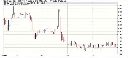 4月15日紐約期棉再度收陰,各合約全面下跌,其中遠期合約跌幅較大,成交量有所萎縮。從4月12日至15日,期棉近期合約已連續(xù)4個交易日收跌。當日市場小幅高開,主力7月合約圍繞178美分/磅附近反復震蕩,最高至179.95美分/磅,最低為176.46美分/磅,盤終前兩個合約微幅收跌,5月合約收于195.52美分/磅,跌52點;7月合約收于177.40美分/磅,跌60點。其他遠期合約跌幅較大,普遍在200點以上。因高盛公司預期未來幾個月棉花市場走弱,同時他們有部分多頭持倉平倉,因此對期棉市場造成打壓,特別是對遠期合約。