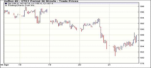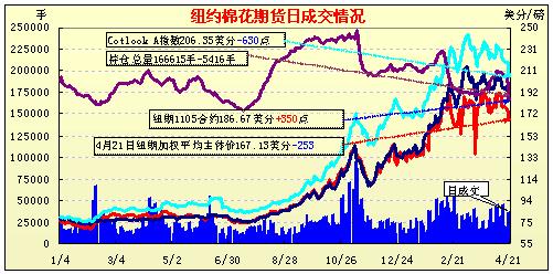 4月21日雖美棉出口周報(bào)利空,但紐約期棉反彈,近期5月合約收漲。當(dāng)日市場(chǎng)小幅低開(kāi),早盤(pán)走強(qiáng),近期5月合約最高至188.82美分/磅,隨后走弱,最低至180.55美分/磅。后外圍谷物市場(chǎng)及原油走強(qiáng),提振棉市,低位買(mǎi)盤(pán)進(jìn)入市場(chǎng)促價(jià)格反彈,盤(pán)終5月合約收于186.67美分/磅,漲350點(diǎn);主力7月合約收于167.51美分/磅,漲45點(diǎn)。本周五為美國(guó)公共假日,因此紐約期棉將休市一天,下周一(25日)恢復(fù)交易,當(dāng)日為近期5月合約第一交割通知日。截至昨日,本周近期5月合約累計(jì)下跌885點(diǎn),主力7月合約跌989點(diǎn),12月合約上漲296點(diǎn)。