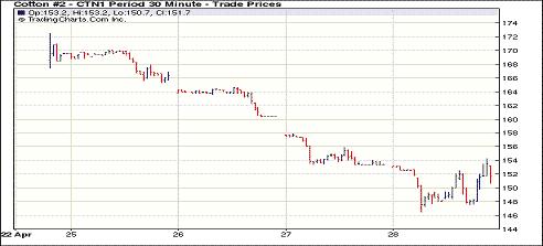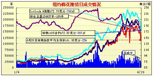 4月28日紐約期棉近期合約因基本面利空受到打壓 中幅下跌,遠期合約普遍上揚。當日美棉出口周報顯示前一周出口再度為負的一萬噸,近期1105及1107月合約受到賣盤打壓。其中5月合約最低至161.81美分/磅,跌幅達2309點。盤終5月合約收于172.82美分/磅,跌207點;7月合約收于152.02美分/磅,跌137點。因美國德州天氣干旱,三角洲遭遇暴雨,對遠期合約形成支撐,1112合約收于126.58美分/磅,漲198點。