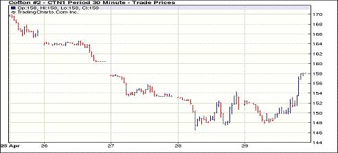 4月29日紐約期棉受到貿(mào)易買盤支撐及外圍市場提振尾市大幅反彈,主力合約收于600點(diǎn)漲停板。當(dāng)日市場先抑后揚(yáng),主力7月合約開盤后走弱,最低至147.80美分/磅,隨后有大量來自紡織廠的買盤涌入市場,促價(jià)格反彈且快速沖高,尾盤時(shí)達(dá)到漲停板。盤終近期5月合約收于178.78美分/磅,漲596點(diǎn);7月合約收于158.02美分/磅,漲600點(diǎn)。當(dāng)日美元下挫,外圍商品期貨市場普遍上揚(yáng)。