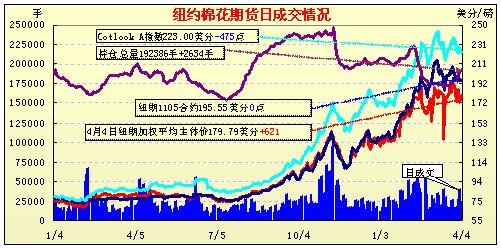 4月4日紐約期棉近期5月合約收于195.55美分/磅,較前一日持平;7月合約收于187.27美分/磅,跌83點(diǎn);遠(yuǎn)期合約全面收漲。當(dāng)日1105月合約受到賣盤打壓低開低走,尾盤時(shí)有少量買盤進(jìn)入市場促價(jià)格反彈,盤終收平;1107月合約小幅收跌。因基金買盤的支持,其它遠(yuǎn)期合約全面收漲,1112月合約收于136.09美分/磅,漲幅391點(diǎn)。分析師指出,遠(yuǎn)期合約上揚(yáng)有基本面支撐的因素,目前市場中轉(zhuǎn)倉活躍,持倉重心逐漸遠(yuǎn)移。