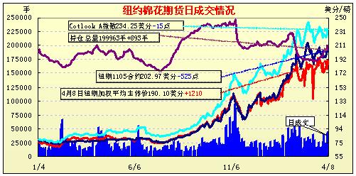 4月8日紐約期棉先漲后跌,雖美國農(nóng)業(yè)部(USDA)報(bào)告利好,但棉市遭到賣盤打壓,近期合約大幅收跌。當(dāng)日USDA預(yù)測中調(diào)減本年度全球棉花產(chǎn)量至2493.7萬噸,調(diào)增全球消費(fèi)至2550.1萬噸,期末庫存調(diào)減17萬噸,至904.7萬噸;受報(bào)告的利好支持,ICE期棉早盤走高,近期5月合約最高至212.40美分/磅。但買盤后續(xù)力量不足,賣盤開始涌現(xiàn),棉市遭到打壓,5月合約大幅回落,最低至201.25美分/磅,較最高點(diǎn)下跌1115點(diǎn)。盤終5月合約收于202.97美分/磅,跌525點(diǎn);7月合約收于189.90美分/磅,跌467點(diǎn);其它遠(yuǎn)期合約普遍微幅收漲。