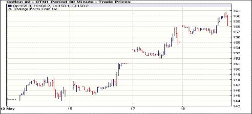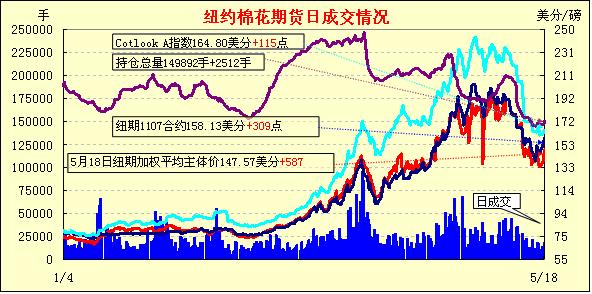 5月18日紐約期棉在外部谷物和其他商品市場(chǎng)整體走強(qiáng)帶動(dòng)下漲勢(shì)延續(xù),近期7月合約結(jié)算價(jià)159.86美分/磅,漲482點(diǎn),1112月合約122.98美分,漲185點(diǎn)。當(dāng)日市場(chǎng)小幅高開(kāi),外部市場(chǎng)美元疲軟,及投機(jī)買(mǎi)盤(pán)促進(jìn)黃金、原油和谷物期貨走高,期棉早盤(pán)強(qiáng)勢(shì)上揚(yáng),7月合約盤(pán)中突破160美分后高位震蕩,12月合約在121-124美分之間波動(dòng),最終以整體上漲收盤(pán)。
