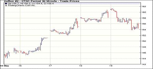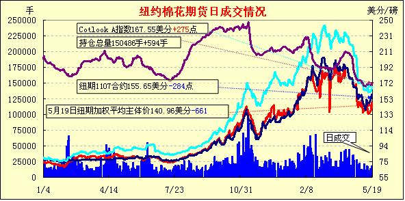 5月19日受技術(shù)面壓力影響,紐約期棉市場全面下跌,近期7月合約結(jié)算價155.65美分/磅,跌248點,1112月合約119.19美分,跌379點。市場平穩(wěn)開盤,早盤延續(xù)最近幾日上漲勢頭,7月合約和12月合約最高分別達(dá)到近四周以來的高點,但技術(shù)面上該兩份合約分別在160和120美分處遇到壓力,盤中高位下滑,7月合約尾段跌停,交易后期低位震蕩,最終收跌400余點,12月合約結(jié)算價低于120美分。分析師指出,基本面上多空信號不一,美國中南棉區(qū)洪災(zāi)逐步好轉(zhuǎn),而德州地區(qū)仍過于干旱,對期棉形成支持;另一方面,美棉出口周報顯示美棉本年度陸地棉簽約仍有取消,可能是市場需求萎縮的表現(xiàn),對期棉不利。