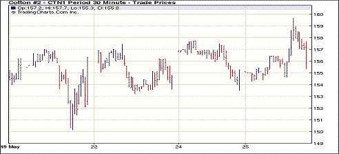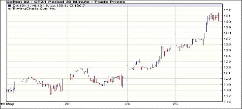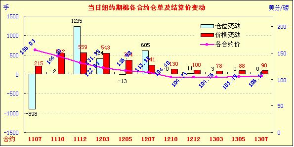5月25日受基本面天氣因素影響及外部商品市場走強推動,紐約期棉大幅上漲,近期7月合約收于156.03美分/磅,漲215點,1112月合約131.35美分/磅,漲559點。當日市場開盤偏弱;因美元走弱原油期貨領漲外部商品市場,美國西德州嚴重的干旱狀態(tài),除對當?shù)孛藁ㄍ猓瑢ζ渌任锂a(chǎn)量也產(chǎn)生不利影響,谷物期貨整體走強,棉花亦獲支持,盤中7月和12月合約向漲停板發(fā)起挑戰(zhàn),但因后期缺乏足夠買盤支持,7月合約回吐部分漲幅,以中幅上漲收盤,12月合約收于近高點。
