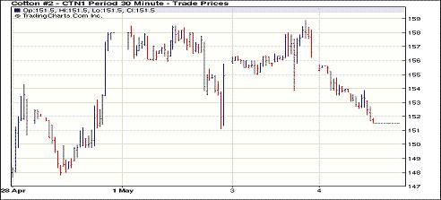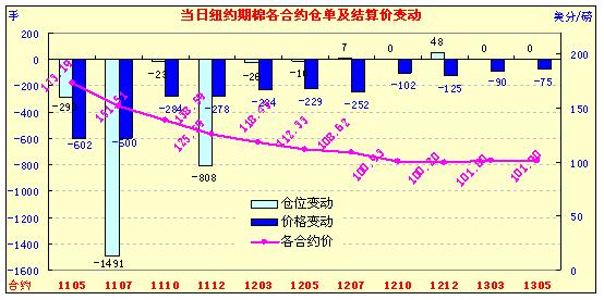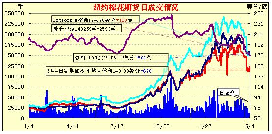5月4日紐約期棉全面下跌,經(jīng)濟(jì)層面出現(xiàn)不利消息,整個(gè)商品市場(chǎng)承壓,主力7月合約跌停,收于151.51美分/磅,1112月合約125.59美分,跌278點(diǎn)。當(dāng)日市場(chǎng)早盤短暫穩(wěn)定,美國(guó)股市下跌,隨后商品期貨市場(chǎng)下滑,期棉出現(xiàn)明顯跌勢(shì),大半個(gè)交易日7月合約在低點(diǎn)徘徊,最終跌停。因相關(guān)經(jīng)濟(jì)數(shù)據(jù)出臺(tái),投資機(jī)構(gòu)表示美國(guó)經(jīng)濟(jì)增長(zhǎng)率預(yù)期可能達(dá)不到4%,加上部分國(guó)家將仍采取更多措施來(lái)遏制通貨膨脹,商品市場(chǎng)承受一定壓力。