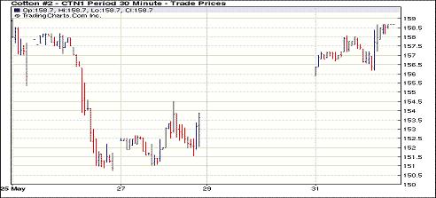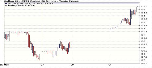 5月份最后一個交易日紐約期棉大幅上漲,近期7月和1112月合約漲停,結(jié)算價分別為158.67美分/磅和135.50美分/磅。投機買盤積極及美國德州不利天氣對市場形成支持,紐約期棉開盤走高,雖然外部谷物期貨市場大豆和玉米期貨走低,但美元下跌抑制外部市場跌勢,棉花期貨盤中高位震蕩。交易后期,投機資金發(fā)力,市場再漲一個臺階,以整體上漲收盤。