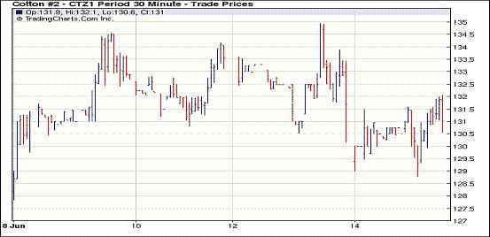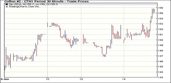 因經(jīng)濟面利好消息,6月14日紐約期棉受商業(yè)及投機買盤支持,近期合約大幅收漲。昨日中國國家統(tǒng)計局公布的數(shù)據(jù)顯示工業(yè)產(chǎn)值上升,促商品期貨市場走強,特別是近一個月來低迷的美國原油市場有了反彈跡象。紐約期棉受到利好支撐,在買盤支持下多數(shù)合約走強。盤終7月合約收于155.54美分/磅,漲459點;12月合約收于131.78美分/磅,漲20點。