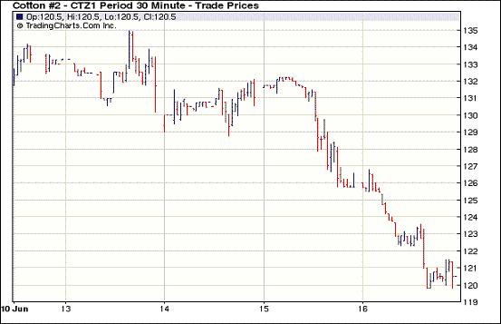 6月16日紐約期棉受外圍影響延續(xù)前一日跌勢(shì),繼續(xù)走弱,近期合約收于跌停板。當(dāng)日市場(chǎng)平開低走,因外圍谷物期貨走弱以及美元強(qiáng)勢(shì)走高,打壓期棉市場(chǎng)下滑。主力12月合約出發(fā)止損賣盤,盤終最低至120.18美分/磅。盤終近期7月合約收于145.96美分/磅,跌600點(diǎn);12月合約收于120.18美分/磅,跌562點(diǎn);12合約兩日來累積跌幅達(dá)1160點(diǎn)。