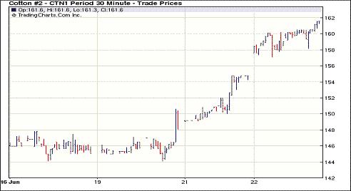 6月22日紐約期棉因基本面利好,主力合約受賣盤打壓下行,近期合約受到支撐漲幅超600點(diǎn)。當(dāng)日主力12月合約早盤走強(qiáng),有消息指出美國(guó)西南棉區(qū)德州、中南棉區(qū)三角洲以及東南棉區(qū)的部分地區(qū)有利好降雨,苗情有所好轉(zhuǎn)。此外外圍谷物等商品期貨走弱,對(duì)棉市形成壓力。因此主力合約遭到賣盤打壓,價(jià)格回落,盤中最低點(diǎn)至119.22美分/磅,尾盤有所反彈,最終收于121.45美分/磅,跌255點(diǎn)。近期7月合約收于161.22美分/磅,漲649點(diǎn)。目前7月與12月合約價(jià)差達(dá)到3977點(diǎn)。