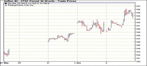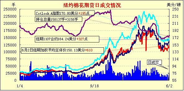 6月2日紐約期棉連續(xù)第四個(gè)交易日走強(qiáng),交投活躍,近期7月合約收于4月25日以來(lái)最高點(diǎn)。當(dāng)日市場(chǎng)早盤窄幅震蕩,后外圍谷物及原油期貨等上揚(yáng)加之期棉基本面利好,買盤活躍,刺激棉市走高,近期7月合約最高至166.23美分/磅。盤中多數(shù)合約收漲,前5個(gè)合約中除10月合約以外均收漲百點(diǎn)以上,7月合約漲327點(diǎn)至164.24美分/磅;12月合約收于139.23美分/磅,漲196點(diǎn)。當(dāng)日轉(zhuǎn)倉(cāng)交易活躍,有大量指數(shù)基金持倉(cāng)從近期7月合約轉(zhuǎn)移至12月合約。