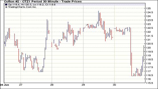 6月30日,紐約期棉延續(xù)弱勢,盤中部分合約跌停,盤尾全面收跌,近期7月合約收于159.79美分/磅,跌235點,主力1112月合約118.59美分,跌281點。在USDA(美國農(nóng)業(yè)部)種植面積和美棉出口報告發(fā)布前,紐約期棉市場窄幅震蕩,報告發(fā)布后市場出現(xiàn)大跌,12月合約跌停(-500點)。USDA報告顯示美棉實際種植面積相比3月份意向面積增加8%,雖然美國德州等地不利天氣將導致新年度產(chǎn)量低于本年度水平,但美棉出口周報顯示美本年度陸地棉出口再為負值,期棉承壓下跌。另一方面,受USDA報告影響,谷物和油料期貨市場下滑(玉米和大豆的種植面積、庫存均高于市場預期),連累期棉。交易后期,12月合約在120美分以下弱勢徘徊,最終以收跌281點。