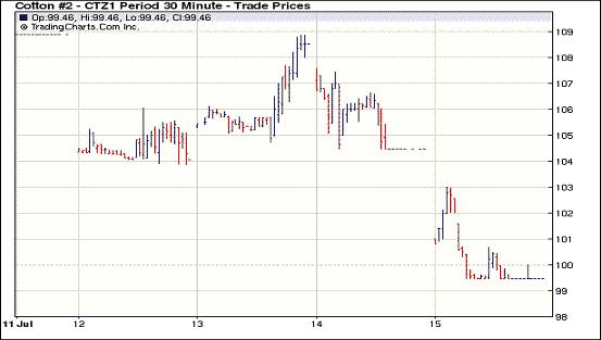 7月14日紐約期棉在基本面美棉出口周報(bào)利空、技術(shù)面壓力和經(jīng)濟(jì)層面三重壓力下前四份合約跌停,其他合約亦大幅收跌,近期10月合約結(jié)算價(jià)106.35美分,主力12月合約104.46美分,1203月合約跌破1美元,收于99.63美分。雖然前一日市場(chǎng)大幅反彈,但14日期棉市場(chǎng)在短暫的平穩(wěn)開盤后呈現(xiàn)跌勢(shì)。從市場(chǎng)動(dòng)態(tài)來(lái)看,美聯(lián)儲(chǔ)主席本-伯南克表示央行不準(zhǔn)備立即推出新的刺激經(jīng)濟(jì)增長(zhǎng)措施,令投資者感到失望,美國(guó)股市和商品市場(chǎng)整體承壓;美棉出口周報(bào)顯示上周美國(guó)本年度陸地棉凈簽約量為負(fù)值;外加技術(shù)面的連續(xù)破位下跌,期棉市場(chǎng)悲觀氣氛加重,最終以全面大跌收盤。