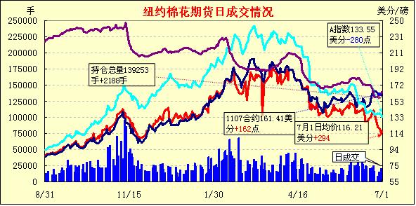 7月份第一個交易日紐約期棉延續(xù)弱勢,7月近期合約反彈,其他遠月合約漲跌不一,交易清淡。7月合約收于161.41美分/磅,漲162點,主力1112月合約117.81美分,跌78點。7月4日是美國獨立日,紐約期貨休市一天。在周末小長假之前,交易商交投謹慎。雖然周四的USDA美棉種植面積報告被認為利空,播種面積超出市場預期,但許多交易商認為旱情可能將導致20%面積廢棄絕收,最終實質的采摘收獲面積將小于預測的1373萬英畝,產量可能低于1800萬包(392萬噸),這將有利于減小價格的跌幅。本周美國德州格蘭德流域遭受了熱帶風暴,部分地區(qū)8天之內遭受大量降雨,給田間管理帶來難度,當?shù)貦C構認為大約19萬英畝棉花將面臨絕收。德州南部地區(qū)的降雨對旱情有所緩解。拉伯克地區(qū)目前還沒有降雨的跡象,旱情依然嚴重。
