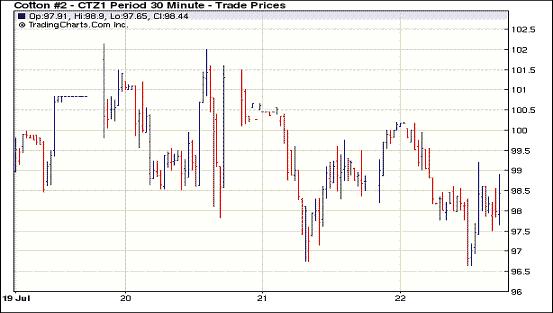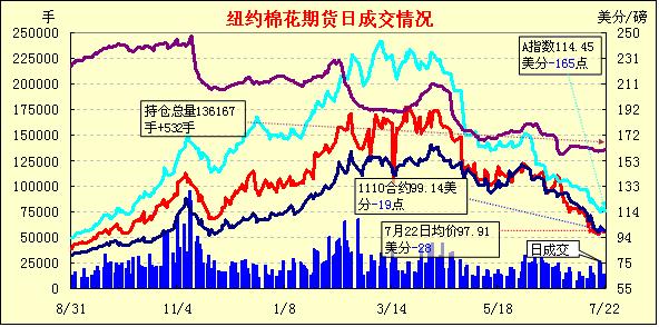 7月22日紐約期棉市場盤中劇烈波動(dòng),最終主力12月合約收平,結(jié)算價(jià)98.64美分/磅,較前一日漲1點(diǎn),1203月合約96.83美分,漲19點(diǎn),其他合約以小幅下跌收盤。當(dāng)日開盤突破100美分后,12月合約早盤缺乏買盤支持下行,在嘗試穩(wěn)于98美分以上失敗后繼續(xù)下滑,后市因外部商品市場先跌后漲以及技術(shù)性買盤支持,該合約最低觸及96.65美分后反彈,最終回歸于98美分以上。雖然美棉產(chǎn)量預(yù)期減少,但全球豐產(chǎn)的預(yù)期,加上主要消費(fèi)國家生產(chǎn)形勢(shì)不容樂觀,期棉市場承受的仍較重。