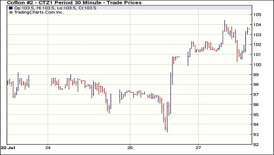 7月27日,受指數(shù)基金買(mǎi)盤(pán)支持,紐約期棉市場(chǎng)不顧外部市場(chǎng)美元走強(qiáng)及谷物市場(chǎng)下跌,以再度上漲收盤(pán),近期10月合約結(jié)算價(jià)103.85美分/磅,漲276點(diǎn),主力12月合約103.61美分,漲285點(diǎn)。當(dāng)日12月合約穩(wěn)開(kāi)穩(wěn)走;受指數(shù)基金和技術(shù)買(mǎi)盤(pán)支持,該合約突破104美分,但最高點(diǎn)達(dá)到104.44美分后缺乏買(mǎi)盤(pán)繼續(xù)跟進(jìn),技術(shù)面上未能突破關(guān)鍵支撐位104.46美分,市場(chǎng)盤(pán)中回落;當(dāng)其跌至101美分一線(xiàn)后買(mǎi)盤(pán)再度介入,最終以200余點(diǎn)報(bào)漲。