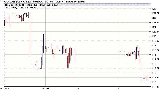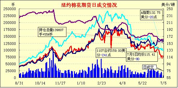 7月5日外部谷物市場(chǎng)走強(qiáng),紐約期棉繼續(xù)下滑,近期7月合約收于159美分/磅,跌241點(diǎn),主力1112月合約115.52美分/磅,跌229點(diǎn)。技術(shù)層面破位,迫使市場(chǎng)進(jìn)一步收跌。當(dāng)日市場(chǎng)早盤(pán)走高,12月合約向120美分靠攏。因缺乏買盤(pán)跟進(jìn),12月挑戰(zhàn)120美分失敗后調(diào)頭向下,當(dāng)該合約跌破116.4美分的支撐位后引來(lái)更多賣盤(pán),最低跌至115.02美分。交易尾段,少量商業(yè)買盤(pán)和空頭平倉(cāng)支持,市場(chǎng)跌勢(shì)暫緩,主力合約終收于近低點(diǎn)。雖然美棉預(yù)期減產(chǎn),但全球需求偏弱,期貨市場(chǎng)缺乏基本面利好因素支持。