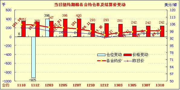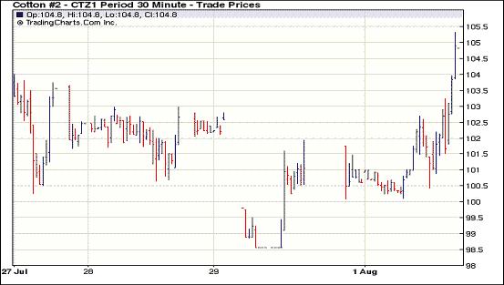 8月1日,紐約期棉2011/12棉花年度和一個(gè)交易日,當(dāng)日開(kāi)盤后成交清淡,窄幅震蕩。至午盤時(shí)各合約漲跌不一,前兩個(gè)合約小幅下跌。受上調(diào)債務(wù)達(dá)成協(xié)議影響,后段買盤涌入市場(chǎng),期棉大幅反彈,主力12月合約快速走高,超過(guò)上周高點(diǎn)104.44美分,并突破105美分關(guān)鍵阻力位,達(dá)到當(dāng)日最高點(diǎn)105.32美分/磅。盤終棉市全面收漲,10月合約收于105.59美分/磅,漲351點(diǎn);12月合約收于105.05美分/磅,漲328點(diǎn),為7月13日以來(lái)最高點(diǎn)。當(dāng)日外圍谷物市場(chǎng)普遍上揚(yáng)。