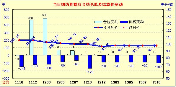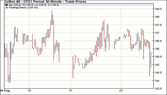 8月23日,紐約期棉交投清淡,投資者普遍持觀望態(tài)度,棉市缺乏支撐,主力合于收跌百余點(diǎn)。當(dāng)日市場開盤后,保持區(qū)間震蕩,外圍商品市場及股市早盤普遍走強(qiáng),為棉市帶來一定支撐,雖主力1112月合約兩次上揚(yáng)至107美分/磅以上,但因缺乏上漲動(dòng)能,很快回落,當(dāng)日最高點(diǎn)為107.25美分/磅。尾盤時(shí)期棉受到賣盤的打壓,收于低點(diǎn)。近期1110月合約收于105.14美分/磅,跌147點(diǎn);1112月合約收于105.24美分/磅,跌121點(diǎn)。其它遠(yuǎn)期合約跌幅在67-172點(diǎn)不等。