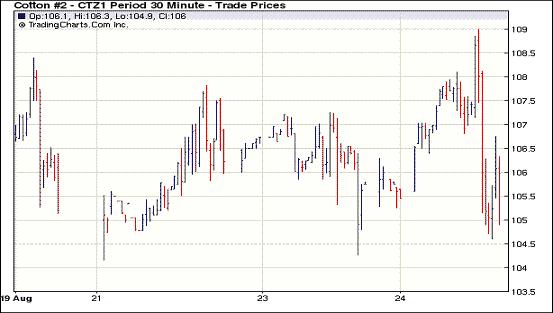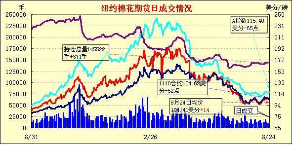 8月24日,投資者仍以觀望為主,棉市支撐不足,紐約期棉前6份合約小幅收跌,其他遠(yuǎn)期月份合約小幅上漲。當(dāng)日市場(chǎng)開盤后,受外圍股市及商品市場(chǎng)走強(qiáng)支撐,主力1112月合約迅速走高;午盤后買盤涌入,促使主力合約突破關(guān)鍵阻力位108.88美分/磅,升高至109.00美分/磅,達(dá)到7月11日113.80美分/磅后的又一個(gè)高點(diǎn);但后續(xù)買盤不足,很快回落,最低至104.61美分/磅,尾盤時(shí)有所反彈,盤終收于104.99美分/磅,跌25點(diǎn);近期1110月合約收于104.62美分/磅,跌52點(diǎn)。