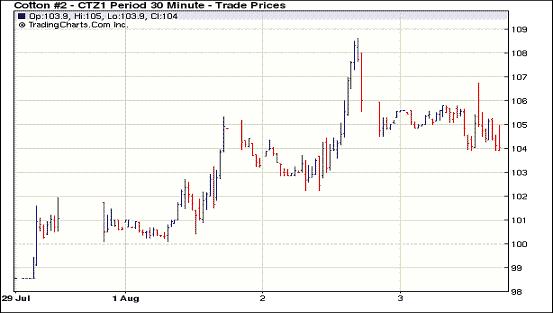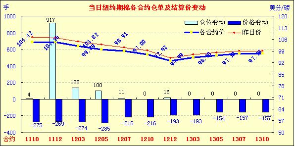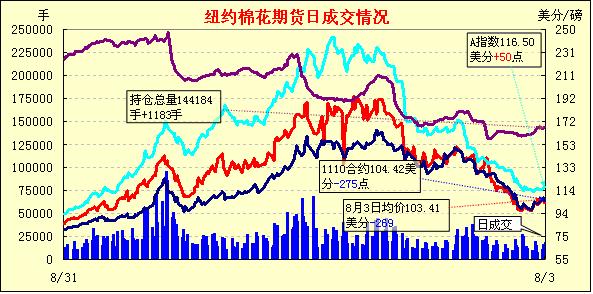 8月3日,紐約期棉受到外圍市場(chǎng)的拖拽全面下跌,主力合約在連續(xù)兩天上漲之后遭到賣盤打壓,收于低點(diǎn)。當(dāng)日由于市場(chǎng)對(duì)經(jīng)濟(jì)前景及需求的擔(dān)憂,商品期貨市場(chǎng)及美國(guó)股市全面下挫。紐約期棉受到外圍市場(chǎng)的影響,遭到賣盤打壓,主力12月合約多數(shù)時(shí)間在低位震蕩,雖一度沖高至106.74美分/磅,但很快回落,當(dāng)日最低點(diǎn)為103.91美分/磅,盤終收于104.16美分/磅,跌269點(diǎn)。近期10月合約收于104.42美分/磅,跌275點(diǎn)。其它合約跌幅在普遍在200點(diǎn)以上。