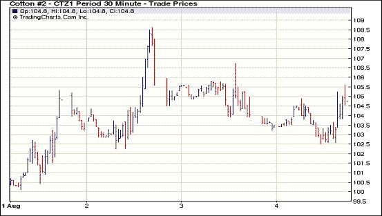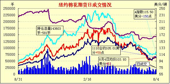 8月4日,紐約期棉先抑后揚,雖外圍市場普遍弱勢,但期棉受到自身買盤支持,主力合約中幅收漲。當日市場開盤后經歷短暫上揚后價格回落,外圍商品市場及美國股市承壓下挫給棉市帶來利空,午盤左右時主力合約達到當日最低點102.51美分/磅。后受到空頭回補買盤的支撐,期棉低點反彈,最終收于104.92美分/磅,漲76點。近期10月合約收于105.01美分/磅,漲59點。1207和1010月合約漲幅較大,超過200點。