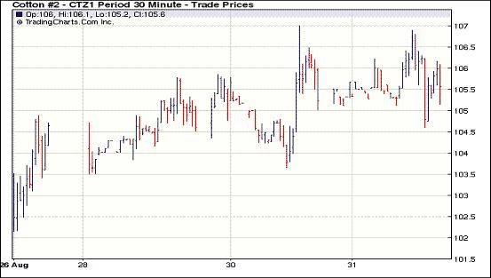 8月31日,紐約期棉成交連續(xù)4個(gè)交易日低于10000手,交易清淡;在外圍市場(chǎng)走低的影響下,期棉前3份合約中幅收漲,其他月份合約普遍收跌。當(dāng)日棉市開(kāi)盤后震蕩走低,后受買盤支撐反彈,主力1112月合約沖高至106.89美分/磅,接近前日高點(diǎn)107美分;午盤后外圍谷物及油籽市場(chǎng)走低影響期棉價(jià)格迅速回落,主力合約達(dá)當(dāng)日低點(diǎn)104.60美分,震蕩幅度達(dá)229點(diǎn);其后買盤再度介入,價(jià)格回升回補(bǔ)部分跌幅,盤終主力合約收于105.81美分/磅,漲39點(diǎn);近期1110月合約收于105.88美分/磅,漲97點(diǎn);遠(yuǎn)期合約不同程度收跌。
