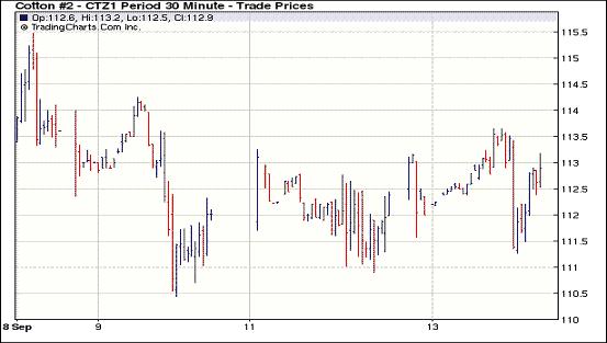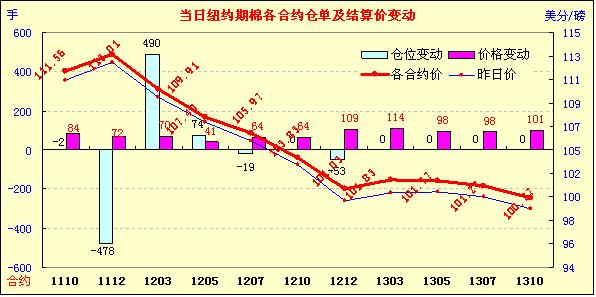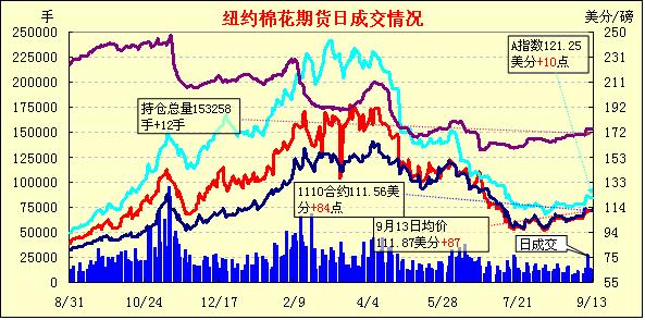 9月13日,紐約期棉成交略顯活躍,在美國最大產(chǎn)棉區(qū)德州產(chǎn)量前景不佳的利好因素支撐下,合約再度全面收漲,近期1110月合約結(jié)算價(jià)111.56美分/磅,漲84點(diǎn),主力1112月合約結(jié)算價(jià)113.01美分/磅,漲72點(diǎn)。當(dāng)日市場(chǎng)開盤短暫走低后很快在買盤支撐下震蕩回升,主力1112月合約達(dá)當(dāng)日高點(diǎn)113.65美分/磅,后受賣盤打壓價(jià)格回落,午盤時(shí)主力合約跌至當(dāng)日最低點(diǎn)111.13美分/磅,震蕩幅度達(dá)252點(diǎn);午盤后買盤再次介入促市場(chǎng)低點(diǎn)反彈回補(bǔ)部分跌幅,盤終主力合約中幅報(bào)漲,其他合約也不同程度收漲。