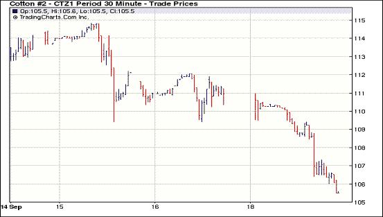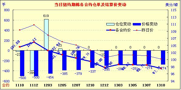 因美元指數(shù)強勁、外部商品市場不振,9月19日紐約期棉受賣盤打壓全面大幅收跌,近期1110月合約結(jié)算價104.08美分/磅,跌500點,主力1112月合約結(jié)算價105.52美分/磅,跌500點,為三周來最低點(9月2日105.89美分/磅);當(dāng)日成交量超過2萬手,較前幾個交易日明顯增加。當(dāng)日市場小幅低開,因美元指數(shù)走強,商品市場整體疲軟,期棉受外圍市場拖拽以及對全球需求憂慮的影響而震蕩走低,午盤后賣盤涌入致價格進一步回落,尾盤跌至跌停板并延續(xù)至盤終。