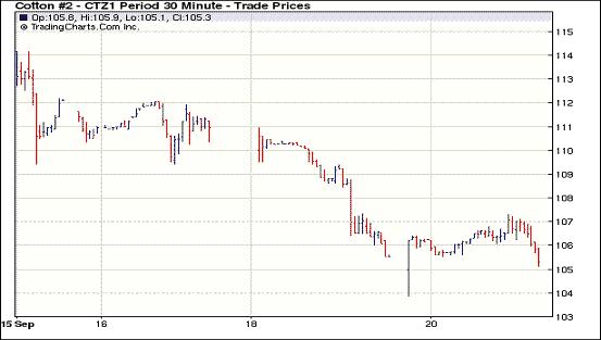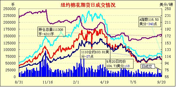 9月20日,紐約期棉受賣盤打壓近期合約普遍收跌,1110月合約結(jié)算價(jià)103.81美分/磅,跌27點(diǎn),主力1112月合約結(jié)算價(jià)105.41美分/磅,跌11點(diǎn);其他遠(yuǎn)期合約漲跌不一;成交持續(xù)清淡。當(dāng)日市場早盤受全球需求憂慮減輕及外部市場走高提振,近期合約普遍上漲,主力1112月合約達(dá)當(dāng)日最高點(diǎn)107.30美分/磅(+178點(diǎn));午盤后賣盤涌入致價(jià)格走低,主力合約回落至103.86美分/磅,震蕩幅度達(dá)344點(diǎn);尾盤受買盤支撐低點(diǎn)反彈回補(bǔ)部分跌幅,盤終主力合約微幅收跌,其他合約漲跌不一。