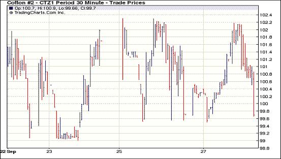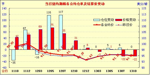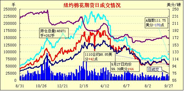受美元走弱、市場預(yù)期歐元區(qū)債務(wù)危機的最終解決方案有望取得進(jìn)展,外圍商品市場及股市走強支撐,9月27日,紐約期棉多數(shù)合約上漲,1110月合約結(jié)算價98.85美分/磅,漲42點,主力1112月合約結(jié)算價100.15美分/磅,漲51點,盤中震蕩幅度達(dá)268點。當(dāng)日市場開盤震蕩走低,后外圍市場及股市走高帶動期棉一同上漲,主力合約沖破1美元最高至102.18美分/磅;尾盤時賣盤涌入回吐部分漲幅,盤終主力合約小幅收漲,其他多數(shù)合約也不同程度告漲。