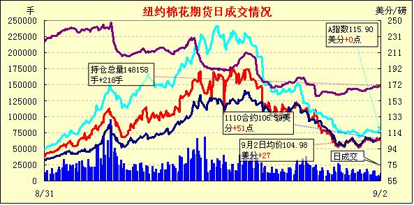 9月2日,紐約期棉前兩份合約小幅上漲,其他合約全面下跌,近期10月合約結(jié)算價(jià)106.59美分/磅,漲51點(diǎn),主力12月合約105.89美分,漲11點(diǎn)。雖然美國(guó)墨西哥灣再度生成風(fēng)暴對(duì)美國(guó)南部棉花形成威脅,但美國(guó)8月非農(nóng)就業(yè)不盡人意,市場(chǎng)承受一定壓力。當(dāng)日市場(chǎng)穩(wěn)開(kāi)高走,主力12月合約再度沖向107美分的關(guān)鍵阻力位,但因美國(guó)8月非農(nóng)就業(yè)增幅為零,令投資者擔(dān)心美國(guó)經(jīng)濟(jì)將受到更多國(guó)會(huì)黨派爭(zhēng)斗的拖累;多家大型銀行面臨政府起訴,經(jīng)濟(jì)方面壓力迫使期棉受外部原油期貨和股市等市場(chǎng)不振影響高位下滑,當(dāng)主力合約最低跌至105.01美分時(shí)獲買(mǎi)盤(pán)支持,交易后期窄幅波動(dòng),微幅收漲。