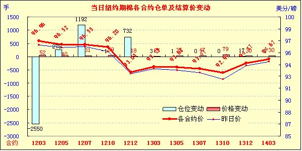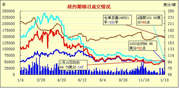 1月10日,因美元走低、美股及原油期貨走高,市場整體人氣樂觀,紐約期棉受提振繼續(xù)收漲,近期3月合約結算價達到近兩個月以來高點,當日收于96.96美分/磅,漲52點,5月合約96.52美分,漲40點。市場當日交易整體平淡,近期3月合約早盤在95.5-96美分間窄幅波動,盤中在96.5左右波動,交易尾段在96.5-97美分間徘徊,最終收于近7周高點。因美國業(yè)績期開局良好和海外市場大幅上揚提振了投資者人氣,昨日美國股市及原油期貨收漲,藍籌股收于去年7月底以來最高水平,市場整體人氣樂觀,紐約期棉受提振繼續(xù)延續(xù)漲勢。此外,基金調倉、美國2012/13年植棉面積或下降及美國棉區(qū)干旱繼續(xù)對期棉形成支撐。