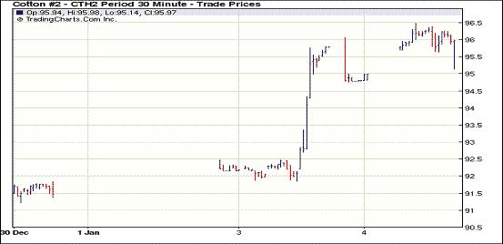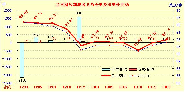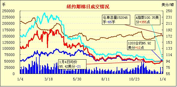 1月4日,市場消息多空交錯(cuò),美國汽車制造業(yè)指數(shù)利好,但圍繞歐元區(qū)流動(dòng)性出現(xiàn)新的擔(dān)憂,紐約期棉在少量投機(jī)買盤支持下再次上漲,主力1203月合約結(jié)算價(jià)95.92美分/磅,漲12點(diǎn),1205月合約結(jié)算價(jià)95.72美分/磅,漲15點(diǎn),其他遠(yuǎn)期合約漲幅23-74點(diǎn)不等。當(dāng)日市場開盤后震蕩走高,主力1203月合約最高至96.48美分/磅;后圍繞歐債危機(jī)擔(dān)憂重燃導(dǎo)致期棉回落,盤終該合約小幅收漲。當(dāng)日外部市場漲跌不一,大豆及原油期貨上漲,玉米期貨持平,小麥期貨收跌。受市場對(duì)歐元區(qū)銀行業(yè)流動(dòng)性問題的擔(dān)憂影響,歐洲股市在近期連續(xù)走高后回落,美股平平,大宗商品市場承壓未能延續(xù)前一日大幅上漲局面?;久嫔?,據(jù)ICAC最新?lián)?cè),全球期末庫存調(diào)增43.4萬噸對(duì)市場造成打壓,巴基斯坦貿(mào)易公司將收購本國棉花則對(duì)其棉價(jià)形成支撐。