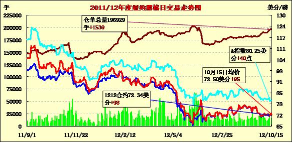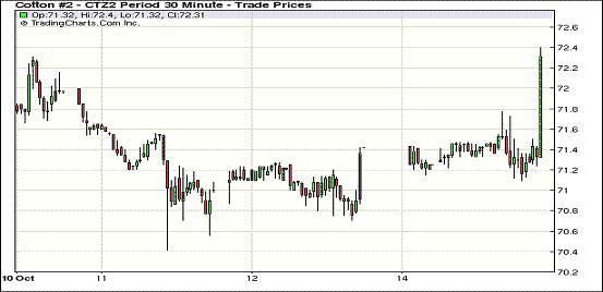 10月15日,紐約期棉繼上周四大跌之后連續(xù)第二個(gè)交易日收漲,1212月合約結(jié)算價(jià)72.34美分/磅,漲98點(diǎn);1303月合約結(jié)算價(jià)72.95美分/磅,漲104點(diǎn)。當(dāng)日市場(chǎng)平穩(wěn)開(kāi)盤(pán),主力12月合約早盤(pán)圍繞71.40美分/磅上下波動(dòng);午盤(pán)后受外部市場(chǎng)走低拖累下行,該合約最低至71.09美分/磅;尾盤(pán)時(shí)市場(chǎng)出現(xiàn)一筆大的訂單促期棉走高,空頭持有者此時(shí)平倉(cāng)促使市場(chǎng)進(jìn)一步上揚(yáng),盤(pán)終該合約收于9月24日以來(lái)最高值。當(dāng)日外部商品市場(chǎng)普遍收跌。