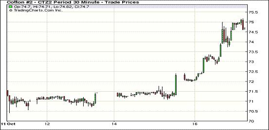10月16日,紐約期棉繼兩連陽后在投機買盤支持下全面大幅上揚。1212月合約結(jié)算價74.86美分/磅,漲252點;1303月合約結(jié)算價74.61美分/磅,漲166點;其他遠期合約漲幅在161-188點之間。市場交易活躍,當日成交量達5.5萬手,為6月19日以來最高值。當日市場平開高走,主力12月合約受買盤支持一路上揚,輕松突破75美分/磅阻力位,當日最高至75.17美分/磅,盤終收于近一個月高點。期棉市場在過去三個交易日連續(xù)上漲,12月合約累計漲幅超過400點。當日外部市場漲跌互現(xiàn)。目前已經(jīng)檢驗的美棉新花有一半以上整齊度不滿足要求,投資者擔心在12月合約的第一交割通知日(11月26日)到來時,符合整齊度的美棉供應(yīng)不足,這在一定程度上對期棉形成支持。