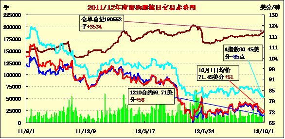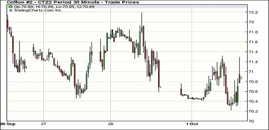 10月1日,紐約期棉全面上揚,近期10月合約結(jié)算價69.71美分/磅,漲56點;主力12月合約結(jié)算價71.20美分/磅,漲55點;其他遠期合約漲幅16-52點不等。ICAC下調(diào)全球棉花期末庫存對市場形成支持。當日市場平穩(wěn)開盤,主力12月合約當日最高至71.32美分/磅,震蕩幅度110點。期棉在過去8個交易日中有6個交易日走低,12月合約上周五(9月29日)跌至70.65美分/磅,為近8周最低點。本周一的反彈回補了部分跌幅。當日外部市場漲跌互現(xiàn),大豆及小麥市場大幅走低,玉米及原油市場走強。國際棉花咨詢委員會(ICAC)公布最新預測,與上個月相比,全球棉花期初庫存調(diào)減90萬包,產(chǎn)量調(diào)增130萬包,消費調(diào)增150萬包,期末庫存調(diào)減80萬包,至7220萬包,此消息促使市場猜測美國農(nóng)業(yè)部(USDA)在其10月份的報告中也將調(diào)低全球期末庫存,這在一定程度上對期棉形成支持。
