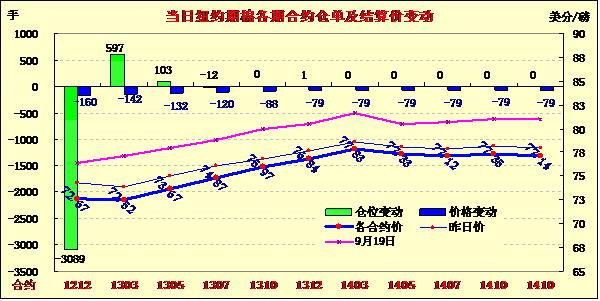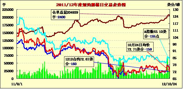 10月24日,在獲利平倉(cāng)及止損賣(mài)盤(pán)的打壓下,紐約期棉延續(xù)前一日的跌勢(shì)繼續(xù)大幅走低,1212月合約結(jié)算價(jià)72.67美分/磅,跌160點(diǎn);1303月合約結(jié)算價(jià)72.52美分/磅,跌142點(diǎn);其他遠(yuǎn)期合約跌幅79-132點(diǎn)不等。當(dāng)日市場(chǎng)平開(kāi)低走,受市場(chǎng)對(duì)全球經(jīng)濟(jì)增速擔(dān)憂(yōu)的拖累,主力12月合約開(kāi)盤(pán)后震蕩下行,早盤(pán)在73-73.5美分/磅窄幅震蕩。該合約上周曾勁漲7.7%至近五個(gè)月高點(diǎn),本周在經(jīng)濟(jì)擔(dān)憂(yōu)及獲利平倉(cāng)/止損賣(mài)盤(pán)打壓下回落,重回70-75美分區(qū)間。12/3月合約價(jià)差進(jìn)一步縮小,當(dāng)日價(jià)差為15點(diǎn)。外部大豆及小麥?zhǔn)袌?chǎng)收漲,玉米及原油期貨收跌。美國(guó)9月份預(yù)售屋銷(xiāo)量升至兩年多來(lái)的最高水平,但美國(guó)聯(lián)邦儲(chǔ)備委員會(huì)重申了對(duì)經(jīng)濟(jì)的擔(dān)憂(yōu),這抵消了住房數(shù)據(jù)的積極影響,美國(guó)股市延續(xù)跌勢(shì)。此外,市場(chǎng)預(yù)期美國(guó)農(nóng)業(yè)部將于今晚公布的最新美棉出口周報(bào)數(shù)據(jù)不佳,同時(shí)2012/13年度美國(guó)之外的國(guó)家棉花產(chǎn)量增加、進(jìn)口減少,尤其是中國(guó),這將對(duì)美棉出口產(chǎn)生不利影響。