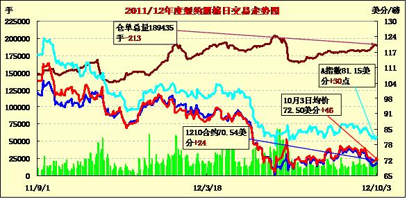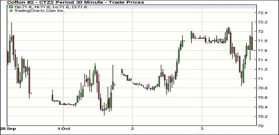 10月3日,受市場預(yù)期上周美棉出口銷售情況利好支持,紐約期棉多數(shù)合約連續(xù)第三個(gè)交易日收漲,近期10月合約結(jié)算價(jià)70.54美分/磅,漲24點(diǎn);主力12月合約結(jié)算價(jià)72.16美分/磅,漲31點(diǎn)。當(dāng)日主力12月合約上半場運(yùn)行平穩(wěn),基本圍繞71.80美分/磅之間上下震蕩;午盤后在外部商品市場拖累下快速下行,當(dāng)日最低至70.85美分/磅,震蕩幅度136點(diǎn)。因市場預(yù)期美棉銷售情況良好,期棉翹尾反彈,主力合約盤終自9月25日以來首次收于72美分之上。該合約三個(gè)交易日累計(jì)漲幅約151點(diǎn)。