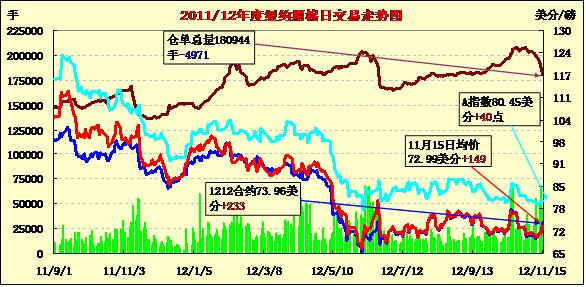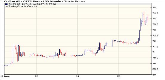 11月15日,紐約期棉市場(chǎng)拋開外部股市和商品市場(chǎng)整體收跌的因素,再度以全面上漲收盤,近期12月合約結(jié)算價(jià)73.96美分/磅,漲233點(diǎn),1303月合約72.24美分,漲98點(diǎn)。當(dāng)日12月合約前大半場(chǎng)交易圍繞在71.5-72.5美分間橫盤整理,交易后期沖破73美分,3月合約高開低走,盤中再71.4美分獲得支撐,交易尾段圍繞72美分波動(dòng),終收于該水平以上。分析師指出,有消息稱NCC(美國(guó)國(guó)家棉花總會(huì))年度峰會(huì)上有大量美棉成交意向,促進(jìn)期棉拋開其他市場(chǎng)延續(xù)漲勢(shì)。當(dāng)日12月合約前大半場(chǎng)交易圍繞在71.5-72.5美分間橫盤整理,交易后期沖破73美分,3月合約高開低走,盤中再71.4美分獲得支撐,交易尾段圍繞72美分波動(dòng),終收于該水平以上。分析師指出,有消息稱NCC(美國(guó)國(guó)家棉花總會(huì))年度峰會(huì)上有大量美棉成交意向,促進(jìn)期棉拋開其他市場(chǎng)延續(xù)漲勢(shì)。