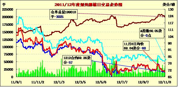 11月8日,紐約期0析市場(chǎng)在前日跌破70美分后繼續(xù)下跌,12月合約結(jié)算價(jià)69.26美分/磅,跌57點(diǎn),1303月合約70.34美分,跌73點(diǎn)。1303月合約持倉(cāng)量首次超過(guò)近期12月合約;市場(chǎng)總成交和期權(quán)成交量均增加。 近期12月合約早盤在70美分以上運(yùn)行,因指數(shù)基金轉(zhuǎn)倉(cāng)打壓,市場(chǎng)一路回落到69美分邊緣,最終收于近低點(diǎn);主力3月合約早盤在71-71.45美分間運(yùn)行,后一路下行至70美分尋找支撐,最終下跌70余點(diǎn)收于該水平一線。雖然美棉出口周報(bào)顯示上周美棉出口增加,但周五USDA(美國(guó)農(nóng)業(yè)部)將發(fā)布供需預(yù)測(cè)報(bào)告,全球高庫(kù)存迫使期棉壓力難釋放。