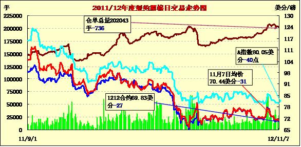 11月7日,紐約期棉市場再度全面收跌,近期12月合約跌破70美分,結(jié)算價69.83美分/磅,跌27點,為自7月25日以來低位,1303月合約結(jié)算價71.07美分,跌17點。歐美經(jīng)濟狀況令人憂慮,對市場形成壓力。12月合約當日交易呈現(xiàn)弱勢狀態(tài),上下波動區(qū)間為69.8-70.54美分,波幅74點,因歐洲經(jīng)濟困境以及奧巴馬再次當選后依然分裂的國會均令投資者感到不安,外圍股市、黃金和原油期貨均有所下跌,期棉受拖累跌破支撐位70美分,最終收于近低點。12/3月轉(zhuǎn)倉交易活躍,市場成交增加。