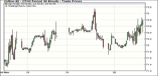 11月20日,紐約期棉市場(chǎng)小幅收漲,近期12月合約結(jié)算價(jià)72.50美分/磅,漲45點(diǎn),主力3月合約72.49美分,漲43點(diǎn)。市場(chǎng)缺乏足夠多空炒作因素,盤(pán)中前兩份合約交易主要圍繞72美分波動(dòng)。當(dāng)日主力3月合約穩(wěn)定開(kāi)盤(pán)后短暫跌破72美分,盤(pán)中圍繞該水平窄幅波動(dòng),交易后期反彈走高,盤(pán)終收于近高點(diǎn)。 美10月新屋開(kāi)建數(shù)字意外攀升,抵消了惠普公司會(huì)計(jì)欺詐事件的影響;伯南克警告國(guó)會(huì)議員應(yīng)達(dá)成協(xié)議、消除有關(guān)財(cái)政懸崖的不確定性因素,美國(guó)股市走高,谷物期貨市場(chǎng)也以上漲收盤(pán),期棉聯(lián)動(dòng)收漲。