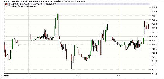 感恩節(jié)假期前,11月21日,紐約期棉市場(chǎng)窄幅波動(dòng),交易仍以12/3月合約轉(zhuǎn)倉(cāng)為主,近期合約收跌,遠(yuǎn)月合約穩(wěn)中有漲,近期12月合約結(jié)算價(jià)72.38美分/磅,跌12點(diǎn),主力3月合約72.66美分,漲17點(diǎn)。22日市場(chǎng)將因感恩節(jié)假日休市一天,23日恢復(fù)交易。主力3月合約當(dāng)日交易圍繞72-73美分間波動(dòng),大部分交易日主要在72.2-72.6美分震蕩,交易尾段發(fā)力試圖沖破73美分失敗,最終收高十余點(diǎn)。分析指出,市場(chǎng)上行遇到全球高庫(kù)存壓力,下行則有美棉下年度面積預(yù)期減少支撐,市場(chǎng)短期內(nèi)仍維持弱勢(shì)震蕩格局。