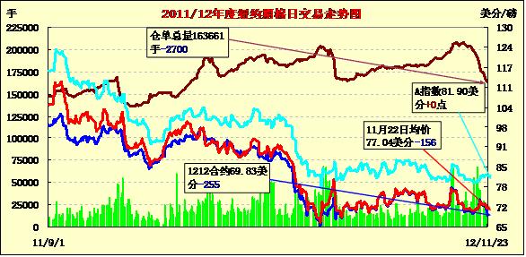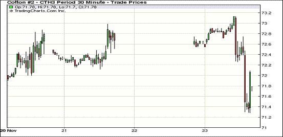 11月23日,紐約期棉市場以全面下跌收盤,近期12月合約結(jié)算價(jià)69.83美分/磅,跌255點(diǎn),主力3月合約71.43美分,跌123點(diǎn)。美棉出口增加,對期棉市場影響有限。 外圍市場整體收高,美棉出口大幅增加,但期棉市場空頭平倉活躍,全面收跌。11月26日為近期12月合約第一個(gè)交割通知日,轉(zhuǎn)倉交易繼續(xù);主力3月合約先漲后跌,上半場交易在72.6美分以上波動(dòng),短暫突破73美分后因缺乏買盤跟進(jìn)滑落至72.4美分一線震蕩,交易后期跳空,有跌破71美分勢頭,尾段小幅調(diào)整,終略收高于71美分支撐位以上,跌幅過百。