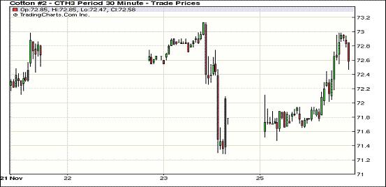 11月26日,紐約期棉強(qiáng)勢(shì)反彈,近期1212月合約結(jié)算價(jià)71.26美分/磅,漲143點(diǎn);主力1303月合約結(jié)算價(jià)72.62美分/磅,漲119點(diǎn);其他遠(yuǎn)期合約漲幅也在百點(diǎn)以上。當(dāng)日市場(chǎng)早盤(pán)運(yùn)行較為平穩(wěn),主力合約主要圍繞71.80美分/磅震蕩。上周五美棉出口周報(bào)數(shù)據(jù)利好雖未對(duì)當(dāng)日市場(chǎng)形成支持,但支撐了周一的市場(chǎng)反彈,外部谷物市場(chǎng)走高及中國(guó)經(jīng)濟(jì)數(shù)據(jù)利好也對(duì)期棉形成支持,該合約后半場(chǎng)一路上揚(yáng),最高至72.98美分/磅,尾盤(pán)雖有所回落但仍以大漲收盤(pán)。當(dāng)日外部谷物商品市場(chǎng)普遍走高,原油期貨走低。近期12月合約進(jìn)入第一交割通知日,尚有未平倉(cāng)合約1154張。分析指出,上周五公布的美棉出口周報(bào)的利好影響在周一反映出來(lái)。此外,中國(guó)11月制造業(yè)加速擴(kuò)張,數(shù)據(jù)顯示,11月匯豐制造業(yè)采購(gòu)經(jīng)理人指數(shù)(PMI)13個(gè)月以來(lái)首次升至榮枯線上方,再次印證了中國(guó)經(jīng)濟(jì)見(jiàn)底并回升,這對(duì)期棉市場(chǎng)形成支持。