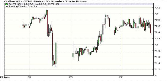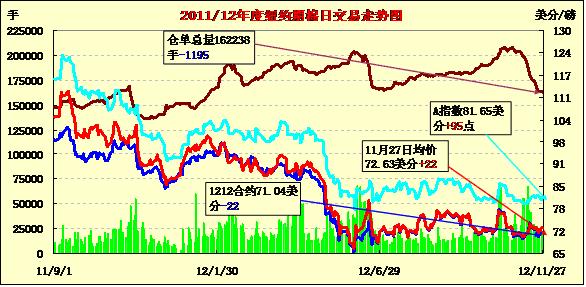 11月27日,經(jīng)濟層面好壞消息參半,紐約期棉微幅下跌,近期12月合約結(jié)算價71.04美分/磅,跌22點,主力3月合約72.523美分,跌10點。因缺乏市場指引,期棉整日交易不活躍,主力3月合約日盤在72.31-72.92美分(波動區(qū)間61點)之間窄幅波動。盡管早間公布的經(jīng)濟數(shù)據(jù)大多利好,但美國參議院多數(shù)派領(lǐng)袖里德稱財政懸崖談判幾乎沒有取得進(jìn)展的消息令市場承壓。分析指出,短期內(nèi)3月合約在73美分遭遇壓力,基本面對行情不利,但從技術(shù)面上看,如市場形成突破,將有望挑戰(zhàn)76美分。