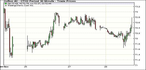 11月28日,紐約期棉市場(chǎng)多漲少跌,近期12月合約結(jié)算價(jià)71.23美分/磅,漲19點(diǎn),主力3月合約72.63美分,漲11點(diǎn)。美國(guó)經(jīng)濟(jì)方面有利好消息,促進(jìn)主力合約先跌后漲。當(dāng)日3月合約平穩(wěn)開(kāi)盤后震蕩下行,盤中試圖在72美分找到支撐,但因缺乏買盤跌破這一水平,最低位71.65美分(-87點(diǎn)),后在美國(guó)政壇領(lǐng)袖的樂(lè)觀講話推動(dòng)下,市場(chǎng)反彈走高,3月合約重回72美分以上。